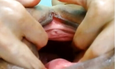 Natural teen is gaping delicate vulva in close range and having