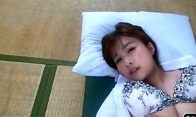 Mature Asian stunner exposes handsome ass to entice her guy into a handjob
