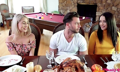 Small breasted, ash-blonde honey is getting banged during a family lunch and eating pussy along the way